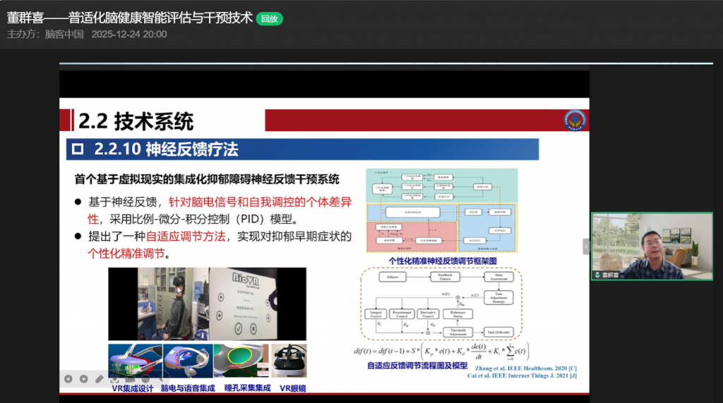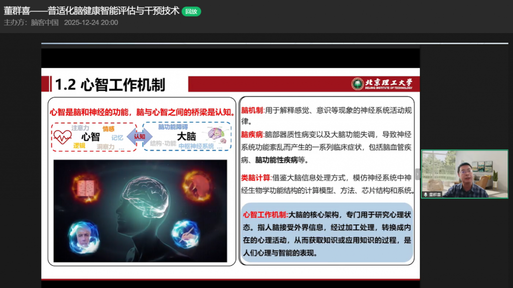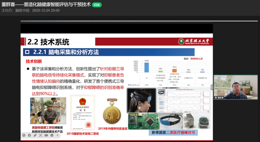 12月24日,在脑客中国直播间,北京理工大学董群喜教授带来以“普适化脑健康智能评估与干预技术”为主题的精彩分享,从背景简介、研究内容到产业落地,全方位拆解脑健康领域的创新突破与应用实践,为观众呈现了一场兼具学术深度与产业价值的知识盛宴。