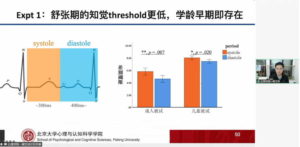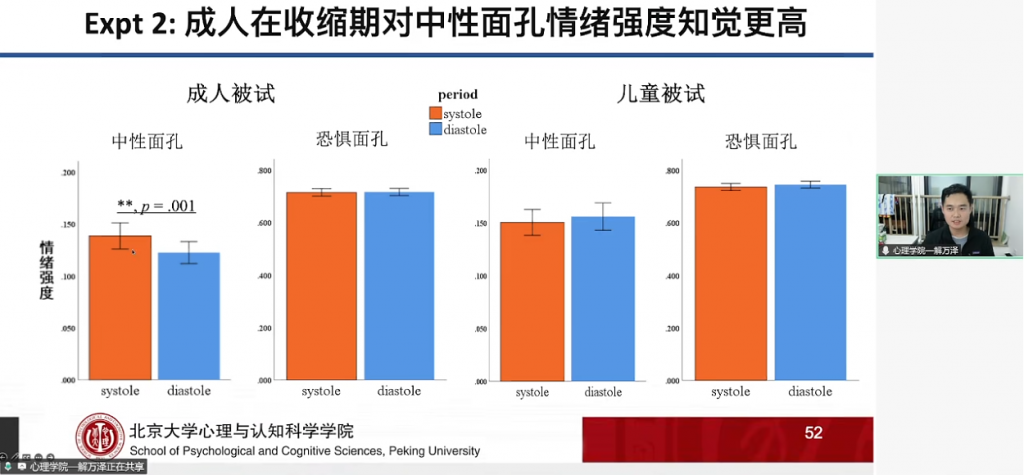 报告最后,解博士提到心脏周期对儿童情绪知觉的影响研究,聚焦了内感受中的心脏周期效应。实验先顺利获得心理物理方法发现,儿童与成人在心脏舒张期的基础视觉加工敏感性更高,该调节作用在学龄早期已稳定出现,属于生理层面的基础效应。后续在情绪面孔知觉实验中,成人对收缩期呈现的中性面孔情绪强度评分更高,而儿童未出现该效应,提示心脏周期对社会情绪知觉的调节机制,需随年龄开展逐步形成,且依赖经验积累与概念知识系统的参与。