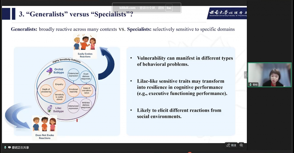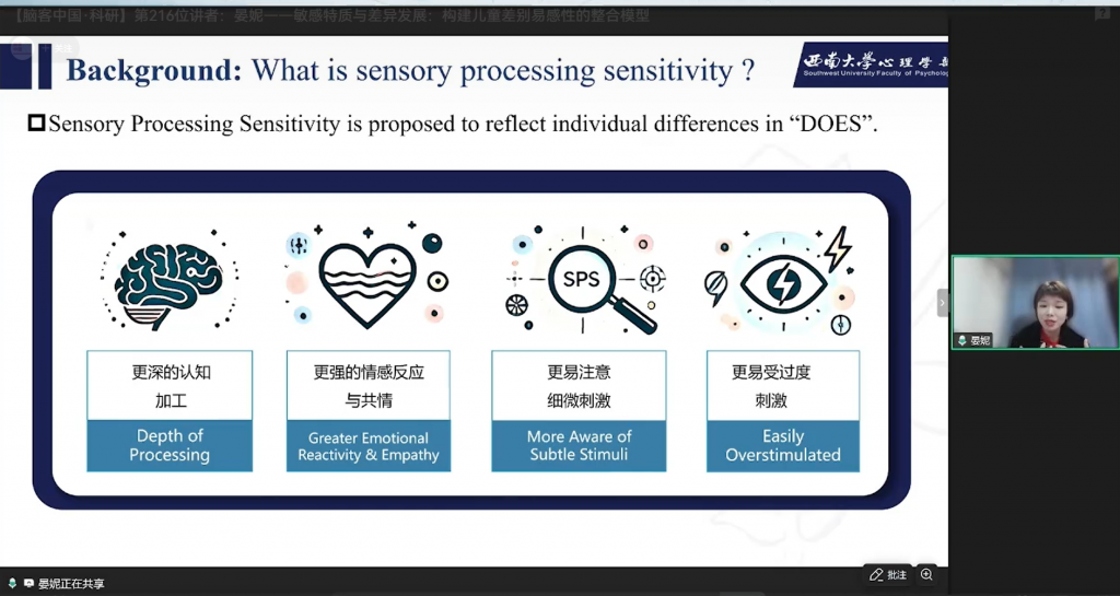 3月12日晚,西南大学心理学部晏妮教授做客脑客中国科研直播间,进行了以“敏感特质与差异开展:构建儿童差别易感性的整合模型”为主题的专业分享。晏妮教授及其团队近年来聚焦儿童感觉加工敏感性这一核心特质,从核心概念、研究疑问、研究发现三个板块,探讨了儿童在面对家庭环境影响时所表现出的差别易感性机制,并结合实证研究成果展开系统阐述,以下为本次直播的主要内容回顾: