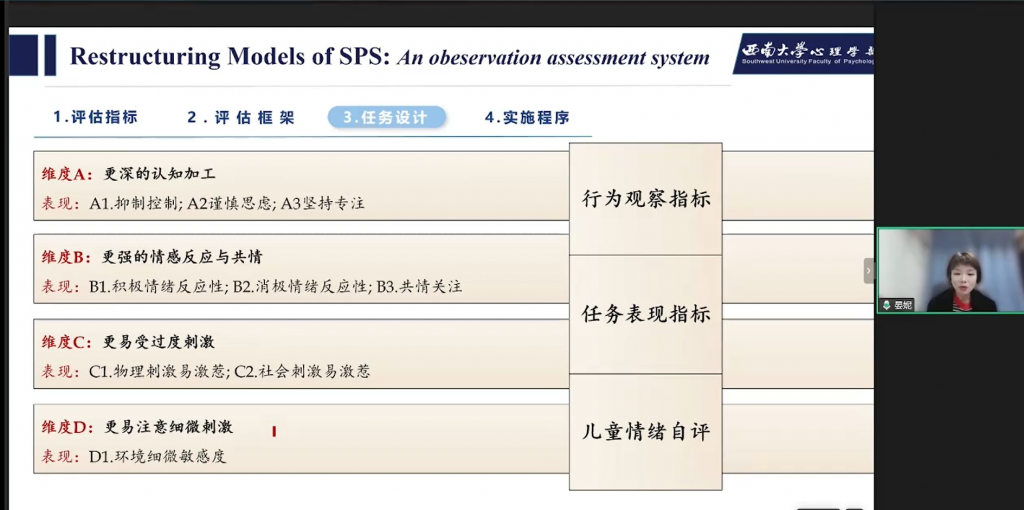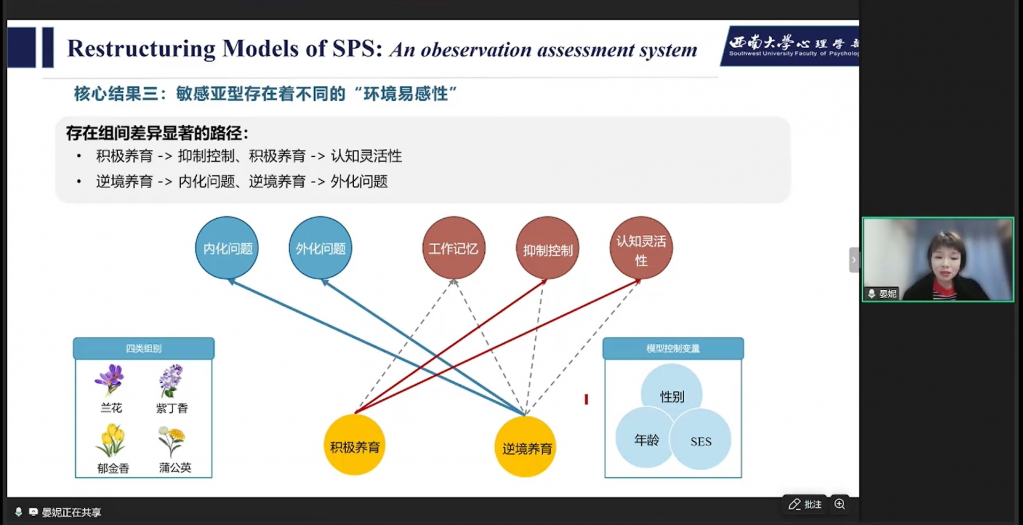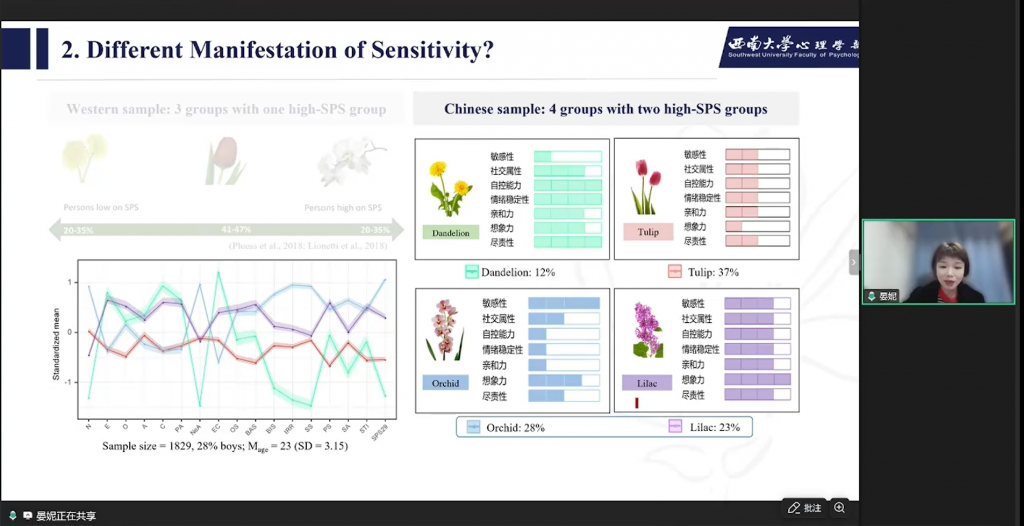 基于新工具研究,得出核心结果:两类高敏感亚型——高敏感兰花vs高敏感紫丁香,表现出对物理刺激和社会刺激的易激惹性不一样;敏感亚型的生理差异,紫丁香型生理反应调节性最差,表现出比较“僵化”的生理调节模式;敏感亚型存在不同的“环境易感性”,在内外化问题、抑制控制、认知灵活性等路径存在显著的组间差异。