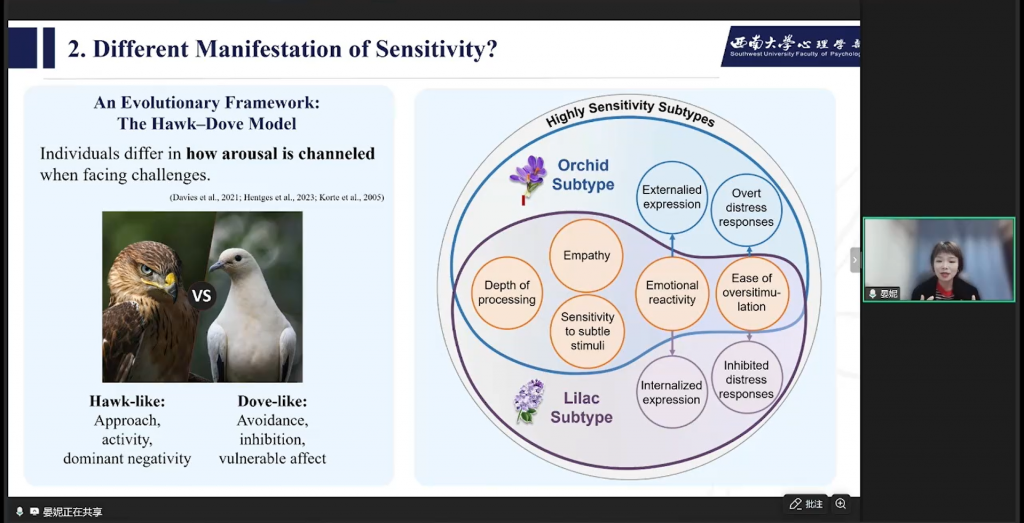 二是敏感性有不同的表现形式/亚型:西方人群存在三类敏感亚型,中国人群则发现两类,一类社交、自控、情绪稳定性强,另一类易出现情绪爆发。顺利获得进化视角下的“Hawk-Dove Model”思考不同敏感性的特质,不同个体面对环境挑战时,它的唤醒程度会被不同方式进行调控。